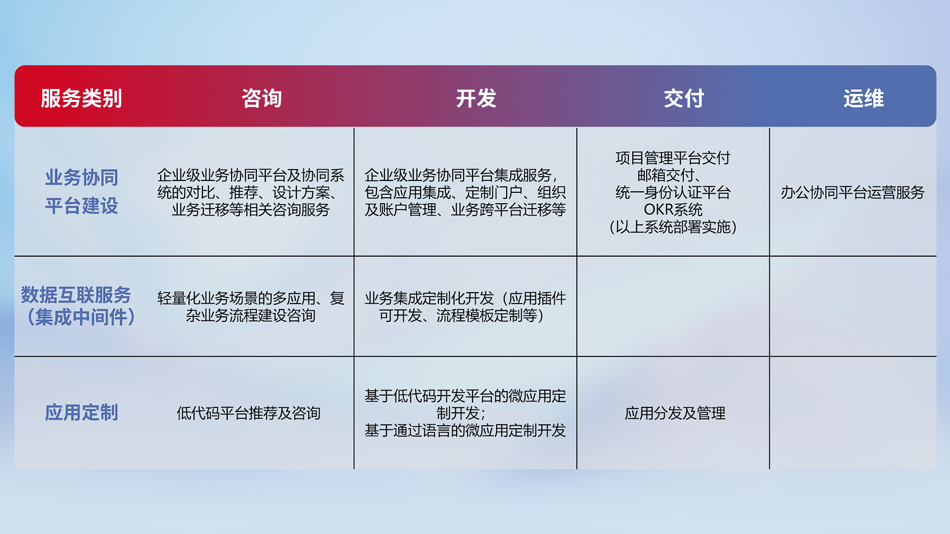 针对钉钉、、、、企微、、、IDaas等平台级产品提供产品的规划、、、方案、、、交付、、、、定制化开发等服务,,,,实现如统一协同办公、、、、智能客户服务、、、、混合会议管理、、智能数据查询、、等业务场景,,,,实现数字化转型。。