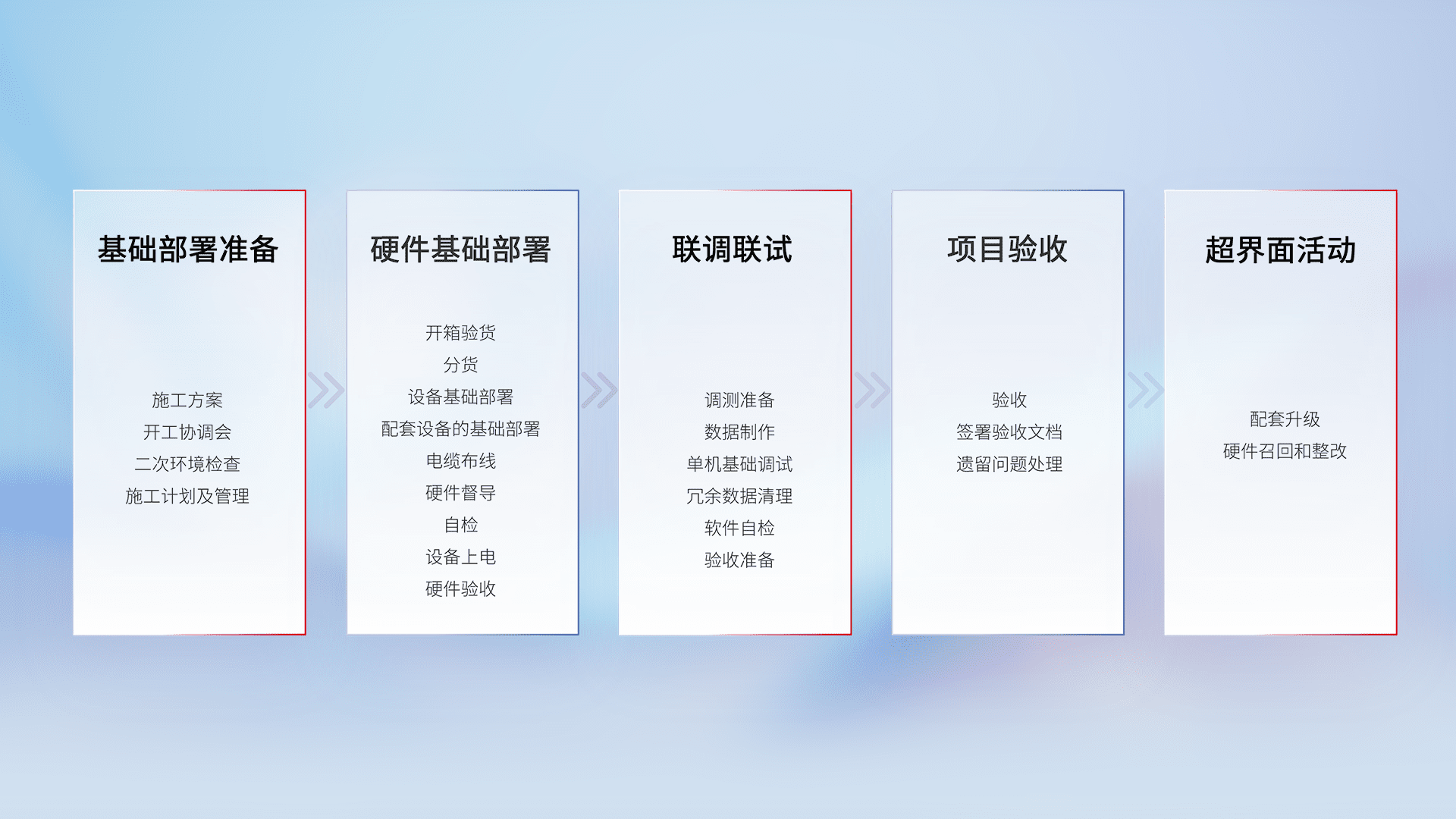 从基础部署准备、、、、硬件基础部署、、联调联试、、、项目验收、、、越界面活动的全过程可追溯,,保证施工质量和进度。。。。